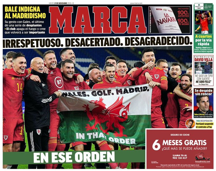 สื่อดังสเปน มาร์ก้า พาดหัวโจมตี แข้งพญาวานร แกเร็ธ เบลว่า “ไม่ให้เกียรติ,ผิดพลาด,เนรคุณ” หลังจากสตาร์ชาวเวลส์ดีใจกับธงที่ทำมาเพื่อล้อสโมสรเรอัล มาดริด