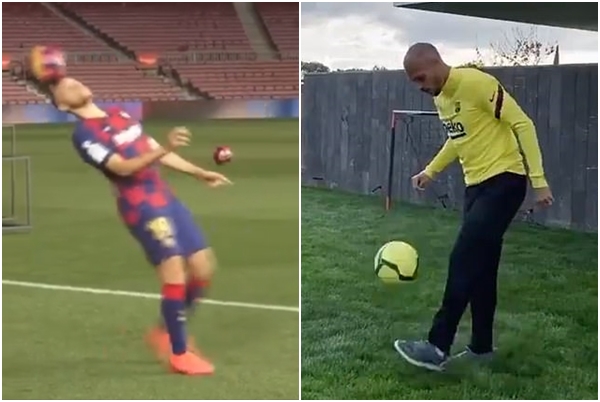 กองหน้าตัวใหม่ของบาร์เซโลน่า มาร์ติน เบรธเวต ออกมาแก้ไขการเดาะบอลที่ผิดพลาดในตอนที่เขาเปิดตัวเซ็นสัญญาในถิ่นคัมป์ นู